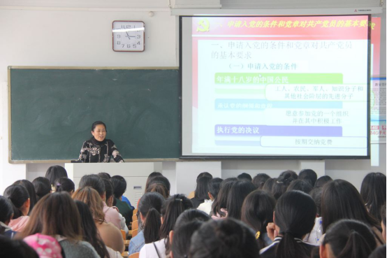刘春卉主任首先对十八大修订后的《党章》对申请入党的条件和党员的基本要求进行阐述,强调严把党员发展的入口关,保障党员发展质量。她着重讲述了党员的权利、义务及其辩证关系,指出党员同志应正确行使党员权利、自觉履行党员义务。随后,刘主任就新修订的《中国共产党发展党员工作细则》的主要内容、特点及新要求进行讲解,她指出发展党员要遵循严格标准、严格培养、严格程序、严格责任四项要求,强调了“控制总量、优化结构、提高质量、发挥作用”十六字方针的重要意义。最后,刘主任为大家详细介绍了入党的基本步骤及注意事项,并传达了中共中央关于提高党员质量,建设信念坚定、素质优良、规模适度、结构合理、纪律严明、作用突出的党员队伍的殷切希望。