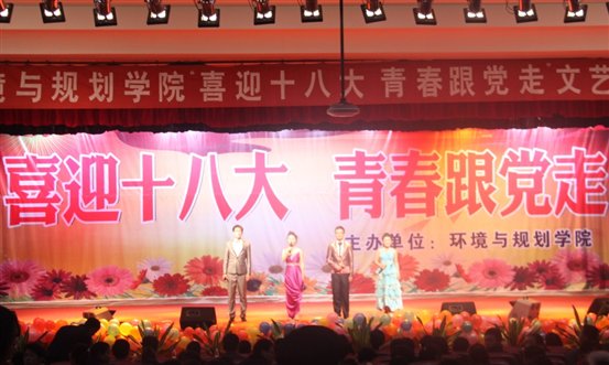 为喜迎十八大的胜利召开,11月4日晚,环境与规划m88help在文化路校区大礼堂隆重举办“喜迎十八大 青春跟党走”文艺晚会暨周未文化广场活动。副校长程印学、蒋志民,工会主席李中华出席了晚会,校党委宣传部、员工处、团委、部分m88help负责人与环境与规划m88help全体师生一同观看了演出。
