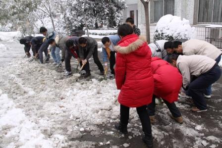 活动开始后,志愿者们挥掀铲、拿扫帚,从系前路到学校主干道,由图书馆到文工团,到处是他们积极忙碌的身影。只见现场,男同志们挥动掀铲破冰开路,女同胞们手拿扫帚清扫积雪,一片热火朝天之景,一派和谐奋进之象。由于结冰层较厚,不仅铲除工作难度较大,而且容易滑倒,志愿者们想尽一切可能的办法,齐心协力,轮番上阵,破冰前行。他们与时间赛跑,在短时间内将学校主要路段、地点的冰雪铲除,使校园交通迅速恢复正常,为广大师生出行安全带来了方便,受到过往师生的赞誉。