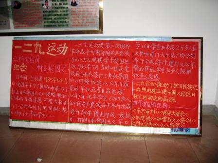 今天是第73个“一二.九”运动纪念日,环境与规划系师生以多种形式纪念这一节日。 在12月9日到来之前,环境与规划系各个教学班纷纷以“一二.九”运动为主题制作了主题板报。系员工会也以在系教学楼入口展出展板等形式迎接“一二.九”运动纪念日的到来,提醒全系师生铭记历史勿忘国耻。晚上,环境与规划系全系员工在文化路校区文工团集体观看了电影< 黄石的孩子>,把同学们带到那个战争的年代,在这个特殊的日子里,激发了大家的爱国热情,让同学们受到了一次深刻的爱国主义教育。