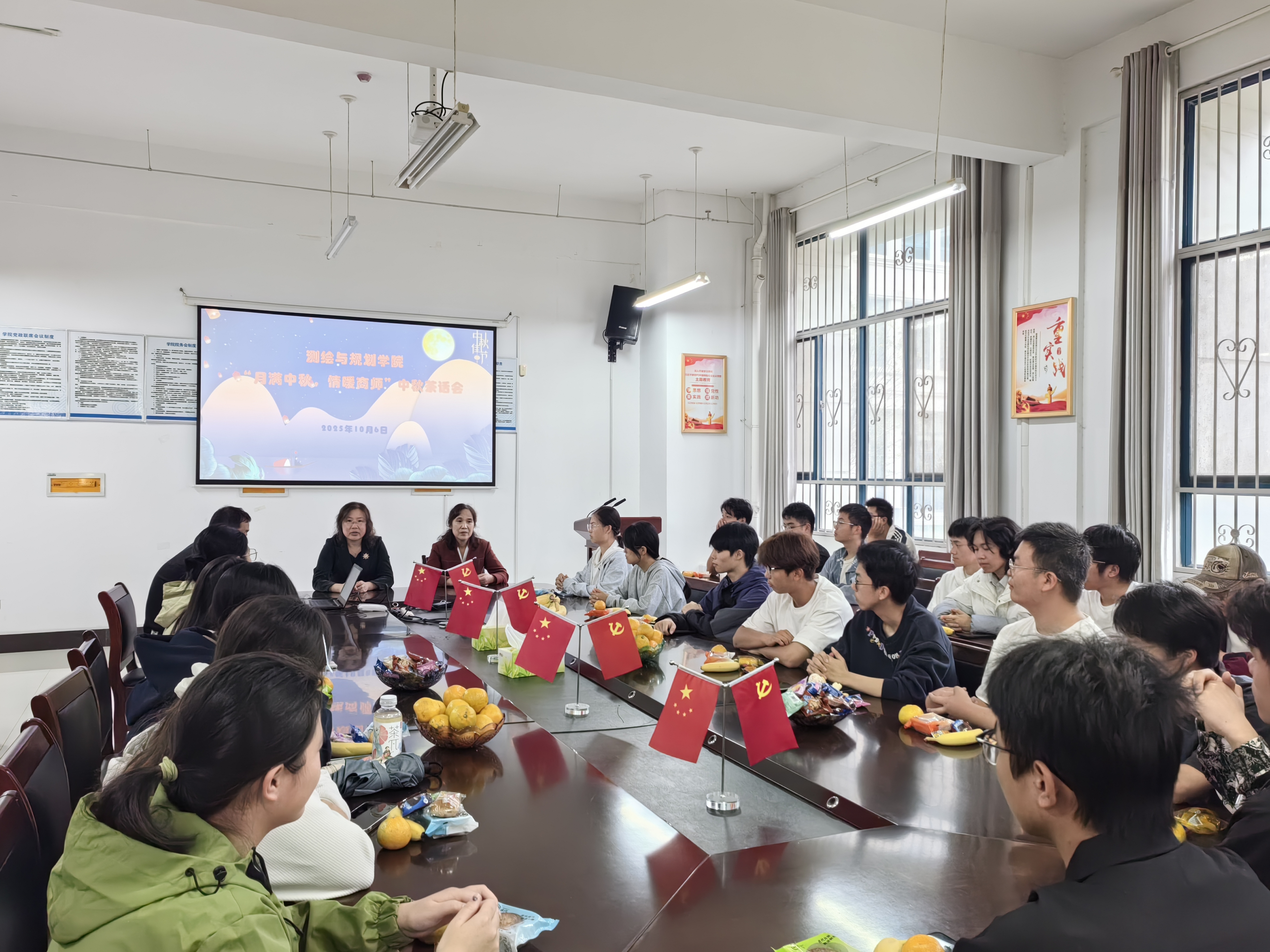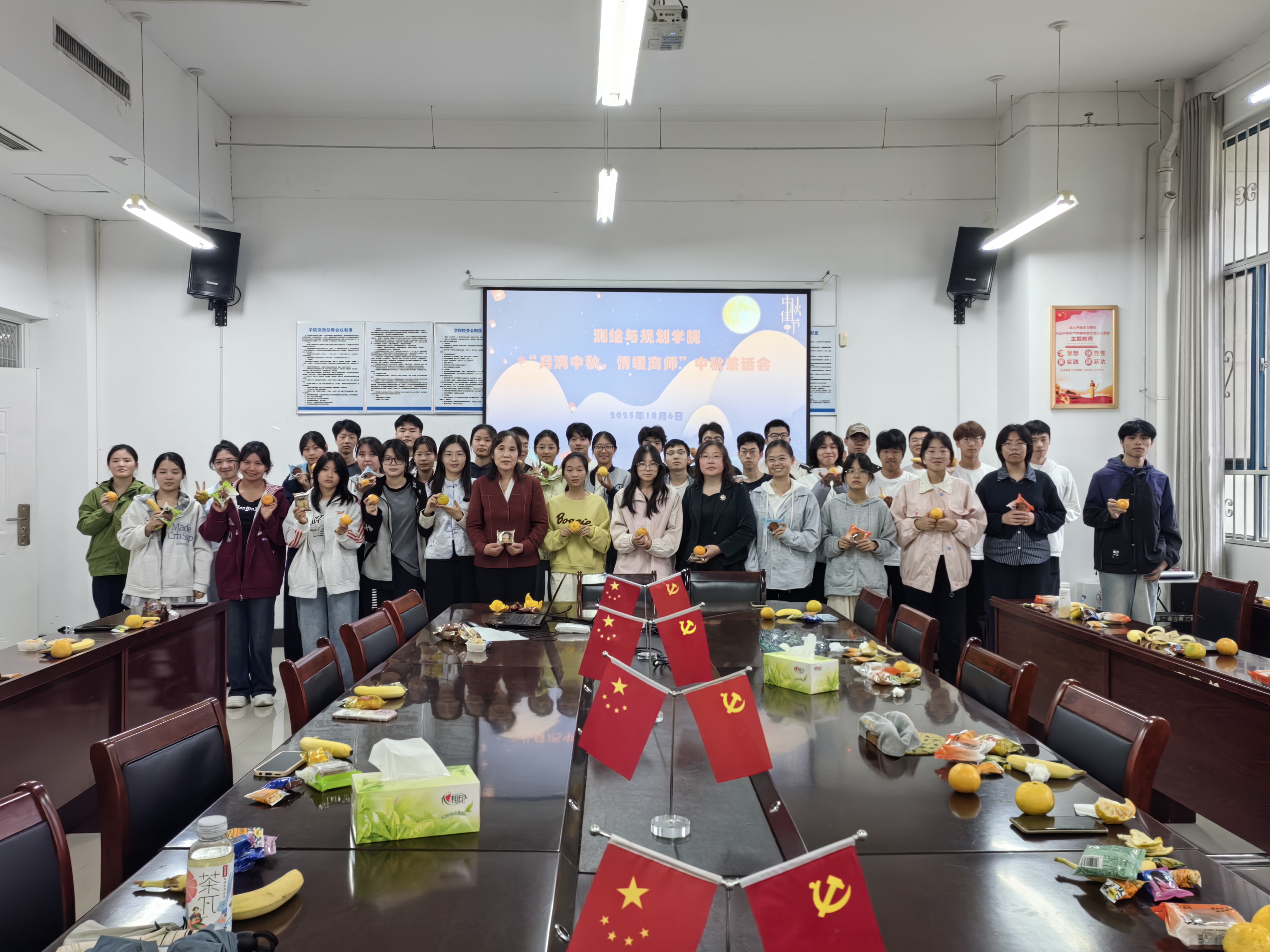 活动伊始,老师们为同学们分发精心准备的中秋月饼、水果、零食等。师生们围坐一桌,一边品尝美食,一边围绕“大学适应情况”“学业规划方向”“日常校园生活”等话题进行交流,新生们主动分享初入校园的感受,老师们耐心倾听并及时回应。
