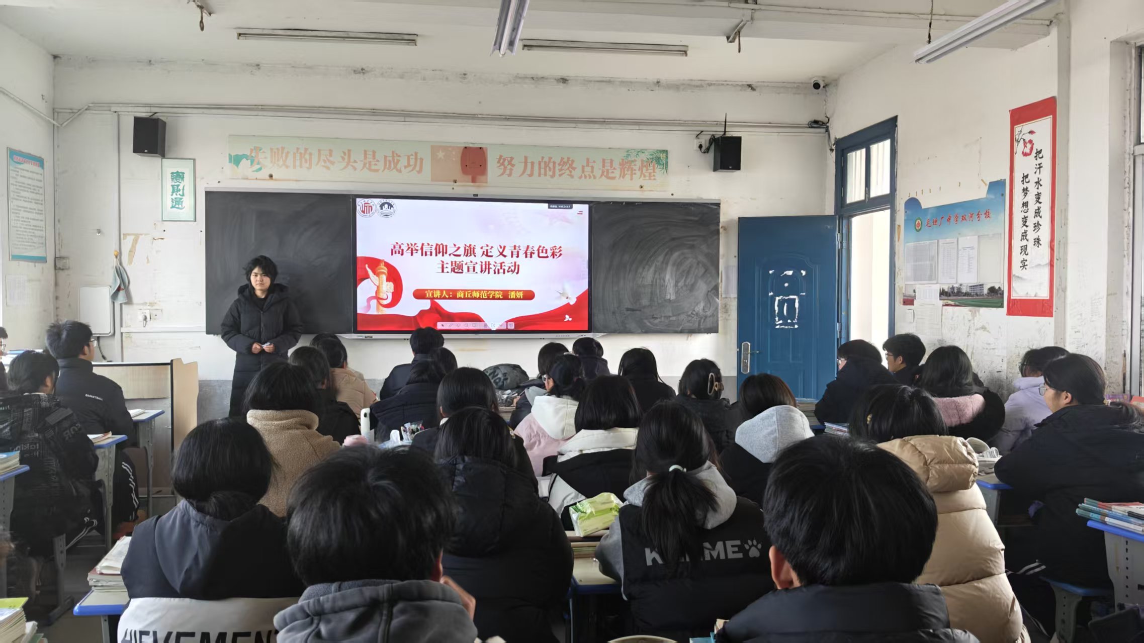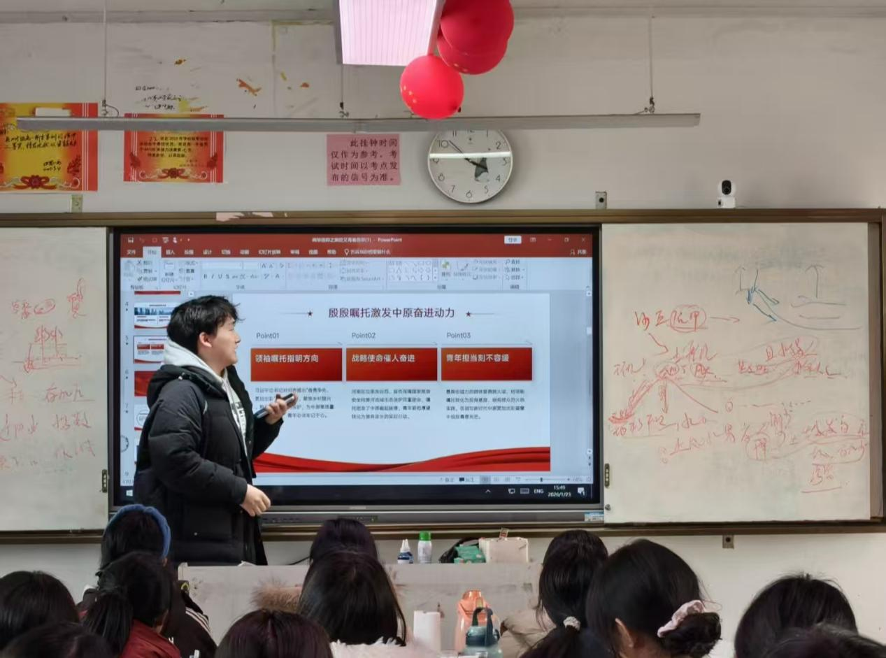 宣讲团成员张俊睿在驻马店市汝南县第一高级中学的课堂上以青言青语向学弟学妹们传递党的创新理论,在实践中锤炼本领、坚定信念,有效激发了青年投身“十五五”建设的责任感与使命感,达到了受教育、长才干、作贡献的活动成效。